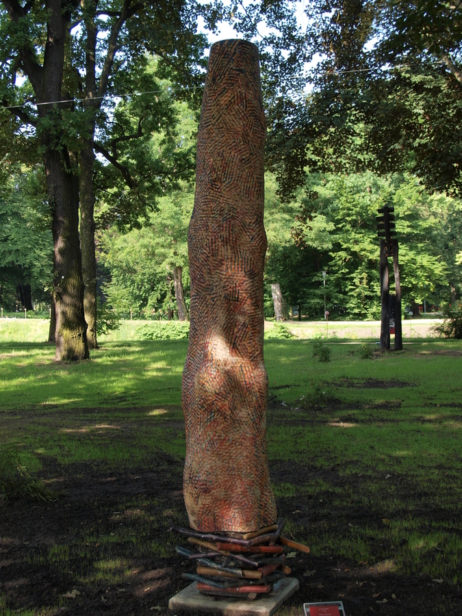Farbenfroh wie der Rosengarten ragt die „Säule“ senkrecht nach oben. Die im unteren Bereich verarbeiteten Äste erinnern mich an die Wurzeln eines Baumes, die der in den Himmeln ragenden Skulptur Halt geben.