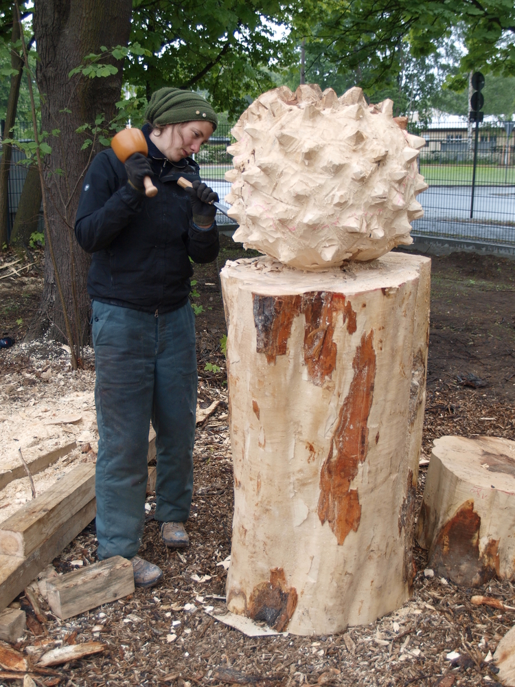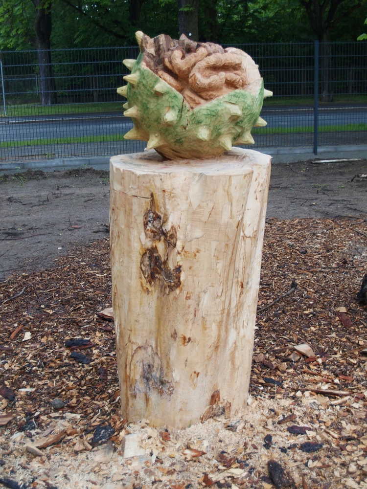 „Sie sehen ja den derzeitigen Stand meiner Skulptur. Oben ist die Kastanie, die aber noch geöffnet wird.“