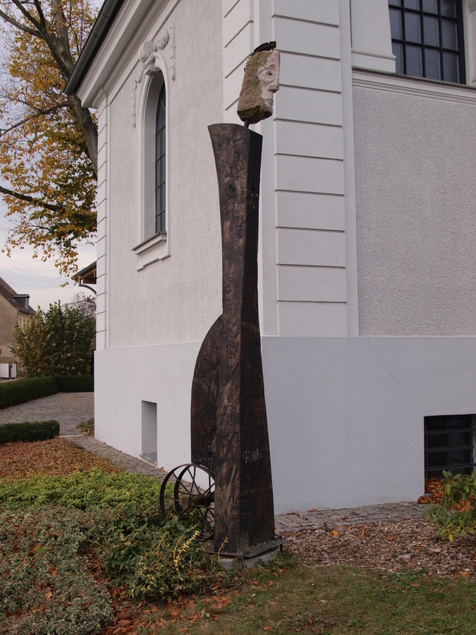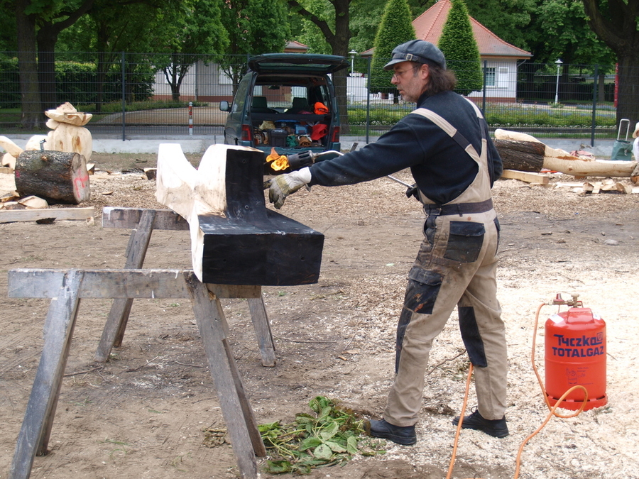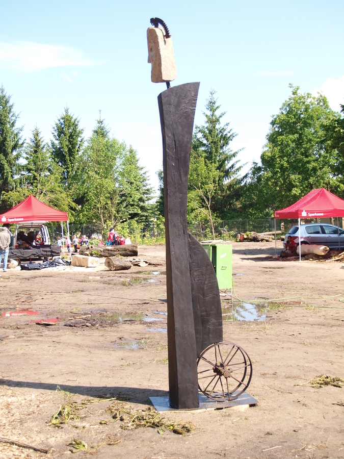 Seine Werkstoffe sind Holz, Stahl und Stein. „Wenn es passt, verbinde ich die Materialien gerne. Mein Entwurf für dieses Symposium verbindet ebenfalls diese drei Materialien.“ Er zeigt auf den zugeschnittenen Stamm: “Das ist die Stele, so etwas 3 Meter lang, darauf kommt ein Steinkopf.“ Ich zeige auf den Stapel mit Holzklötzen, die daneben liegen und frage, ob die Holzteile auch Bestandteil der Skulptur werden. „Nein, das ist übrig … aber andere Künstler werden sie verwenden. Die weitere Ausgestaltung meiner Skulptur wird in Stahl erfolgen.“