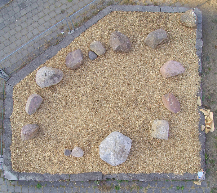 Es ist der Steinkreis, der nach dem endgültigen Arrangement 15 Findlinge enthalten wird, einige davon bearbeitet. 2 bearbeitete Steine befinden außerhalb des Kreises und ein bearbeiteter Stein wird an einem anderen Standort seinen Platz finden.