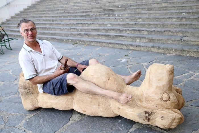 Paolo Vivian nahm am 1. Forster Symposium teil und schuf die Skulptur "Vertica Train", die auf der Reisigwehrinsel zu sehen ist.