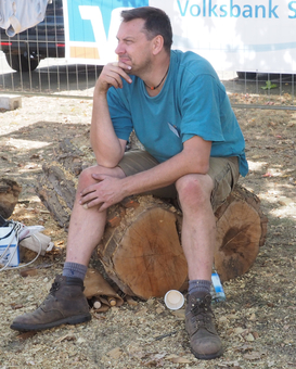 Keith begann gleich, da er wusste ja, was mich interessierte. "Normalerweise habe ich viel Zeit, mich damit zu beschäftigen, in welcher Stadt ein Werk von mir ausgestellt werden soll und mache danach den Entwurf. Bei der Bewerbung hier war das anders, die Zeit war kurz. Natürlich habe ich mich mit der Geschichte von Forst beschäftigt. Dann stellte ich fest, dass die Robinie innen geschädigt war und ich sie aushöhlen musste. Gestern habe ich dir ja noch gesagt, dass ich überlege, ob ich in dem Innenbereich, der Aushöhlung einen frischen Trieb einschnitze ...."