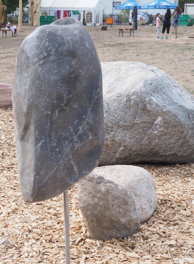 Wir kamen ins Gespräch und er erzählte mir etwas über seine Wahl: “Als ich mir den etwas feuchten Stein betrachtet habe, sah ich einen grünliches Schimmern.“ Er zeigt auf den Bereich und fuhr fort: „Das liegt an dem ganz winzigen Moos. Dann sind hier Bereiche, die Erz enthalten und hier ist eine Form, die an ein Herz erinnert. All das habe ich auf mich wirken lassen; dafür nehme ich mir viel Zeit. Ich muss wissen, war er mir sagt.“ „Du sprichst sozusagen mit dem Stein?“ „Genau, so kann man das ausdrücken.“