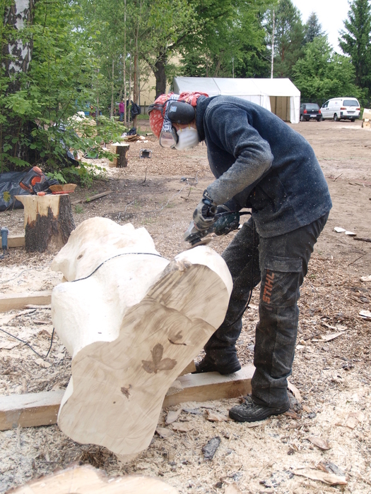 „Ich muß den Stamm sehen, ihn betrachen. Dann ergibt sich die daraus entstehenden Skulptur von allein. Ich kann nicht mit einem gerade gewachsenen Stamm arbeiten. Dieser hier ist für mich ideal. Deshalb mache ich keine Entwürfe vorab.“