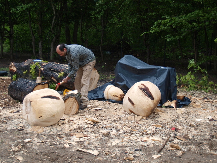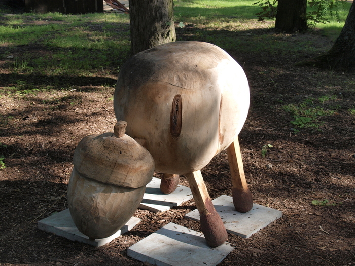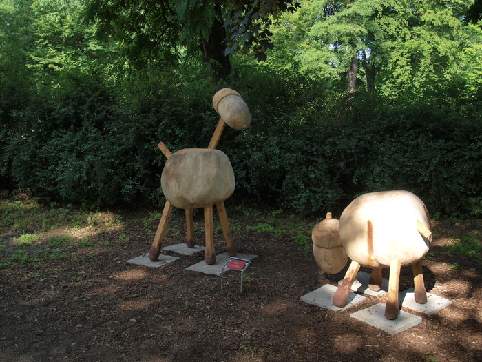 Das nächste Kunstwerk am Skulpturenpfad auf der Reisigewehrinsel, das nach einer kleinen Biegung des Weges ein wenig zurückgesetzt auftaucht, zaubert den Besuchern ein Lächeln auf die Lippen. Jeder erkennt sofort was sich in den beiden Figuren des 1982 in Stollberg geborenen Thomas Junghans mit dem Titel „Kastanientiere“ verbirgt.