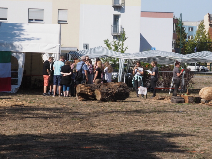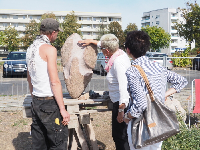 Heute waren weitere Fortschritte an den Kunstwerken zu sehen und Feinheiten wurden herausgearbeitet. Die Bürgermeisterin Simone Taubenek besuchte am frühen Nachmittag den Platz, sah den Künstlerinnen und Künstlern über die Schulter und kam mit ihnen ins Gespräch.