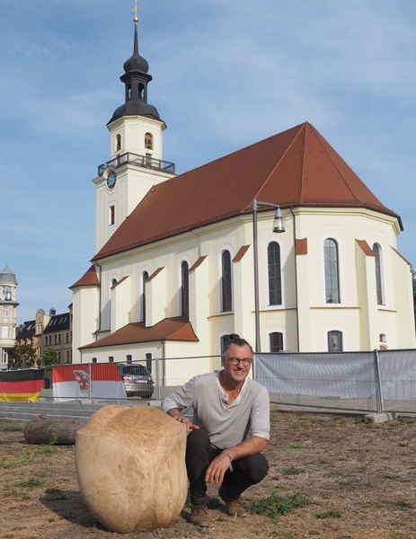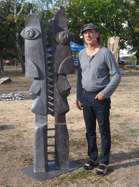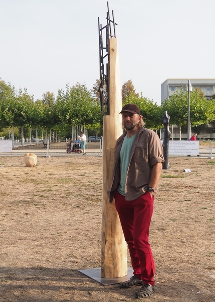 Jörg Tausch (Deutschland) zwischen "Evolution" (rechts im Bild) und "Embryo"